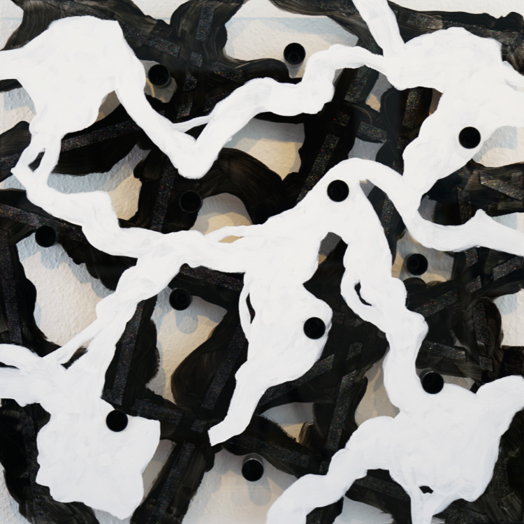 "Schwarze Löcher: Netze", Acryl auf und hinter Acrylglas von 1 cm Stärke, Kunststoffdosen, 80 x 80 x 5,5 cm, 2022