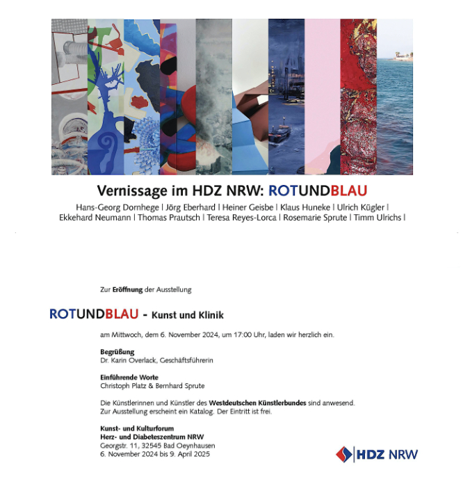 Ausstellungsbeteiligung: Ab 6. November 2024 um 17 Uhr zeigt das Kunst- und Kulturforum des Herz- und Diabeteszentrum NRW in Bad Oeynhausen die Ausstellung "ROTUNDBLAU". Zehn Künstlerinnen und Künstler des Westdeutschen Künstlerbundes präsentieren Werke bis zum 9. April 2025.